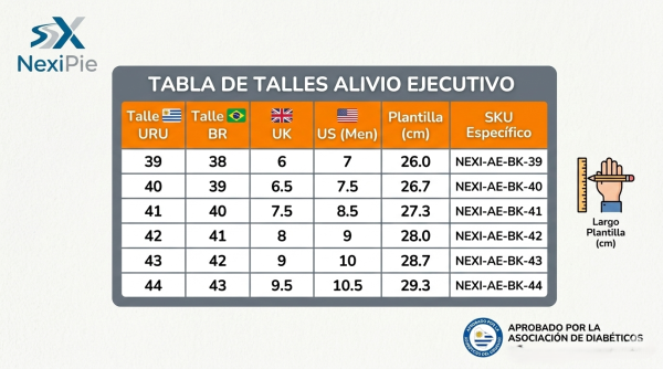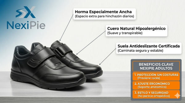 • Descripción Completa: Diseñado para quienes necesitan mantener una imagen formal sin sacrificar la salud de sus pies. El modelo Alivio Ejecutivo está confeccionado en cuero natural ultra suave con un interior 100% libre de costuras expuestas, eliminando cualquier punto de fricción. Su horma extra ancha permite la expansión natural del pie durante la jornada laboral, previniendo puntos de presión.