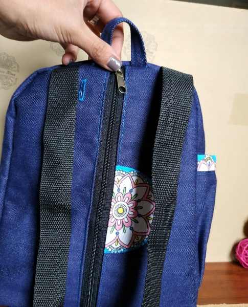 MiniMochila confeccionada en jens. De diseño.  Super original su cierre de seguridad en su espalda. cuenta con un bolsillo abierto exterior,con ojal para pasar los auriculares. En su interior cuenta con un bolsillo con velcro,de buen tamaño.